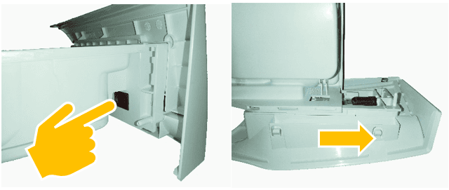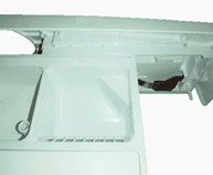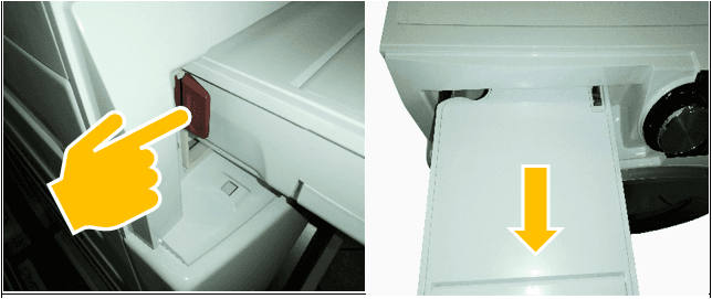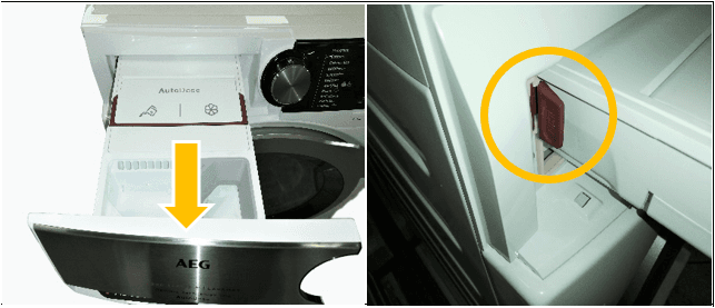 Open de wasmiddellade. De vergrendeling (aangegeven met de naam "PUSH") zal aan de linkerkant zichtbaar komen.