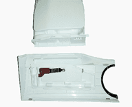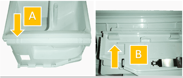 Plaats tijdens de montage de geleider "A" van de wasmiddellade tussen de rails van de handgreep "B".