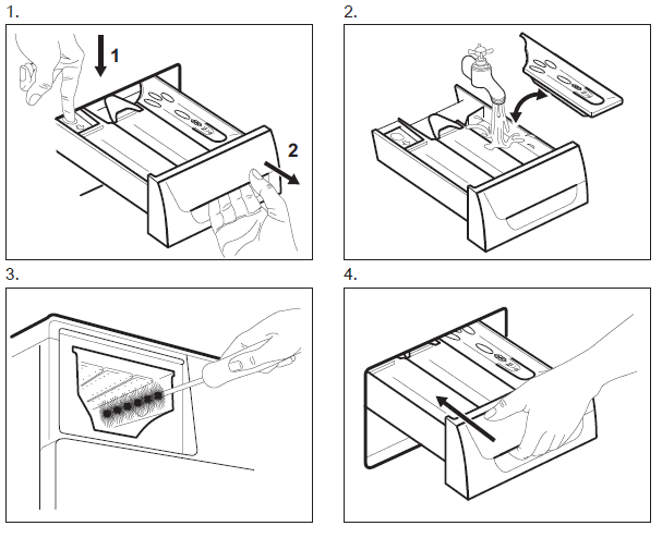 - Reinig regelmatig de wasmiddel bak zoals hier onder aangegeven.